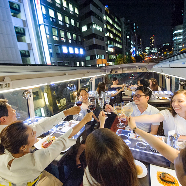 1階がキッチン2階が客席の「走る2階建てレストラン」で、高さ約3mから煌めく川崎工場夜景を眺めながらお食事を楽しめます。今年も川崎夜市とコラボした特別プランを販売いたします。