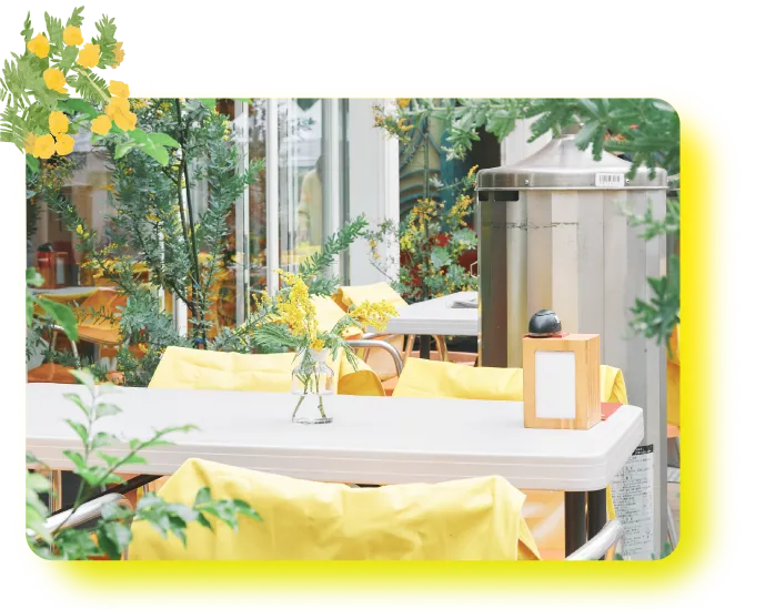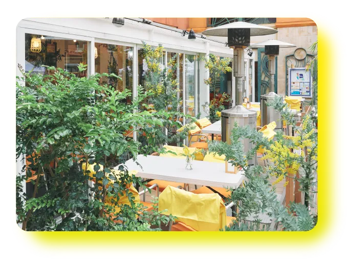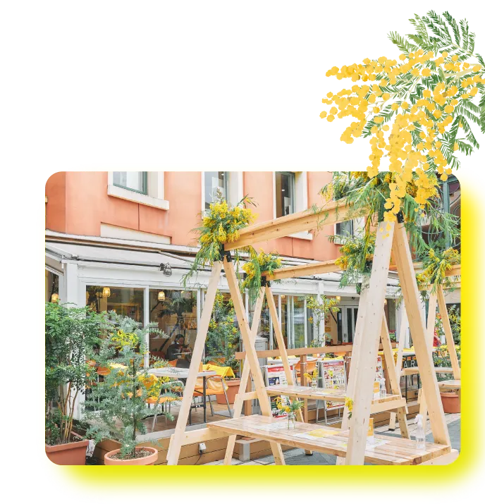 ミモザの花に彩られたオープンエアーな空間で、楽しいひと時をお楽しみください。