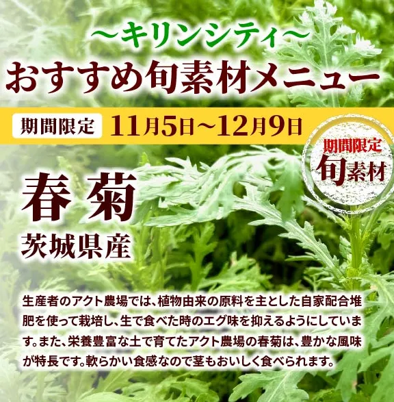 生産者のアクト農場では、植物由来の原料を主とした自家配合堆肥を使って栽培し、生で食べた時のエグ味を抑えるようにしています。また、栄養豊富な土で育てたアクト農場の春菊は、豊かな風味が特長です。軟らかい食感なので茎もおいしく食べられます。