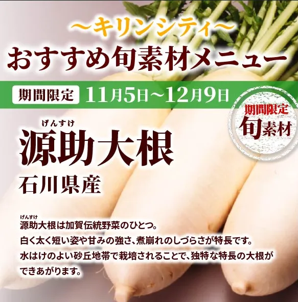 源助大根は加賀伝統野菜のひとつ。白く太く短い姿や甘みの強さ、煮崩れのしづらさが特長です。水はけのよい砂丘地帯で栽培されることで、独特な特長の大根ができあがります。