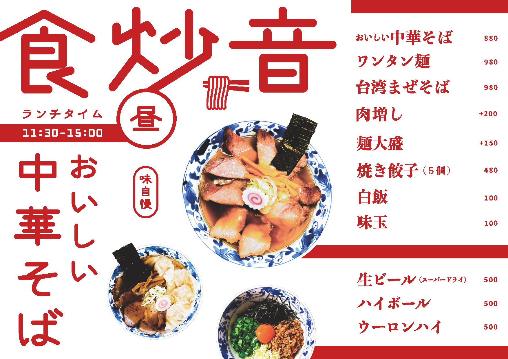 おいしい 中華そば 880ワンタン麺 980台湾まぜそば 980麺大盛 +150肉増し +200焼き餃子(5個) 480白飯 100味玉 100 生ビール(スーパードライ) 500 ハイボール 500ウーロンハイ 500 ※内容が変更になる場合がございます ※詳細は店舗へご確認ください ランチ