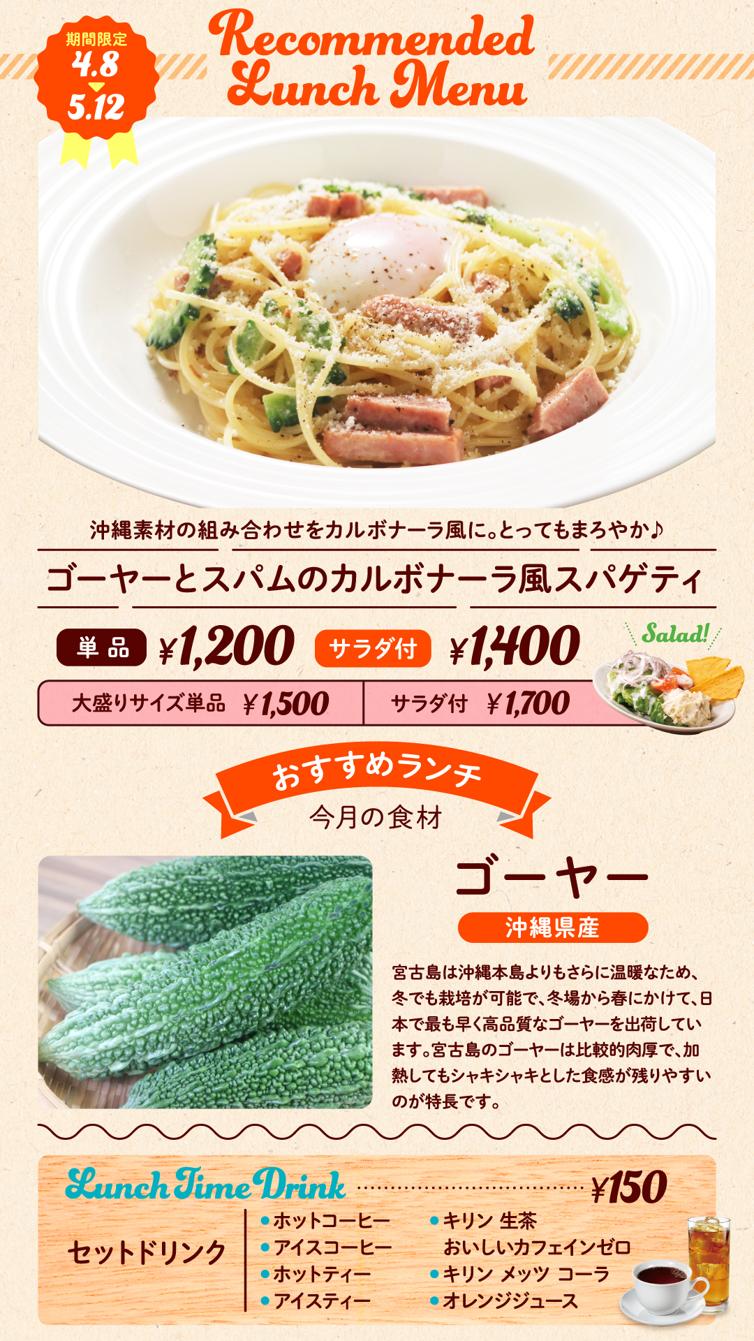 ●ゴーヤーとスパムのカルボナーラ風スパゲティ 1,200円、大盛り1,500円